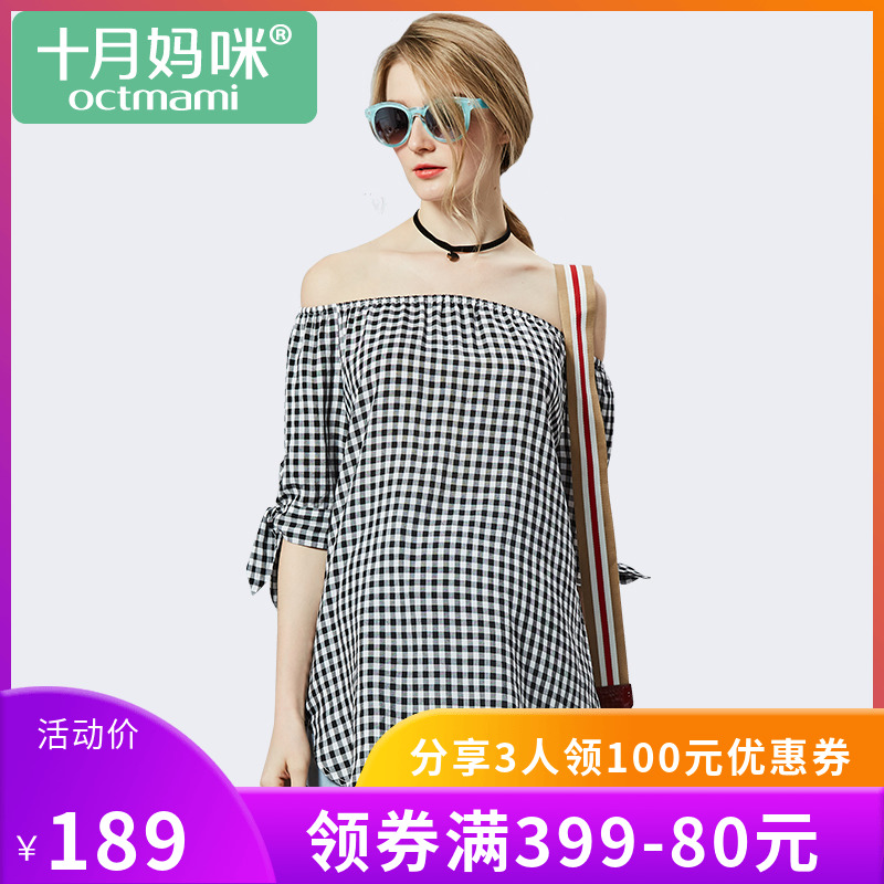 十月妈咪 夏季孕妇一字领棉格上衣 纯色休闲黑白格五分袖孕妇装夏