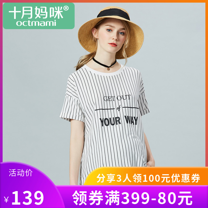 十月妈咪 简约圆领柔软舒适透气孕妇装短袖 孕妇夏季条纹拼接T恤