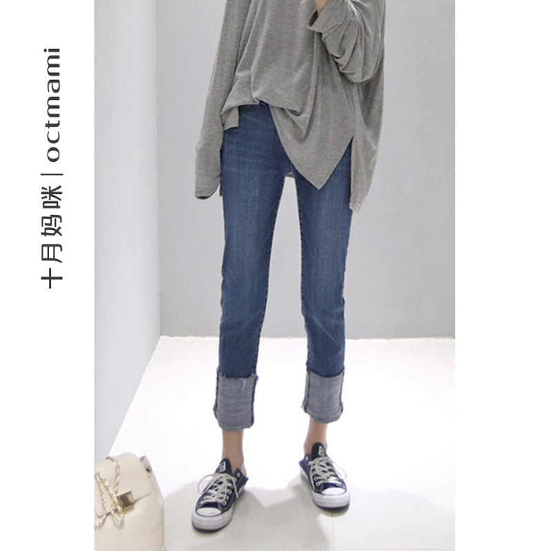 十月妈咪母婴专营【专柜同款】十月妈咪孕妇牛仔裤春秋托腹休闲牛仔卷边九分裤春装